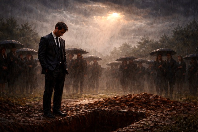 Cold rain poured down from dark clouds. Ken wiped the tears from his face. He looked at his family and friends, all wearing black. They all picked up dirt and threw it into the hole. They covered the box where his father lay dead. Ken's chest felt empty. His hands felt cold. He wanted to scream, but no sound came out.